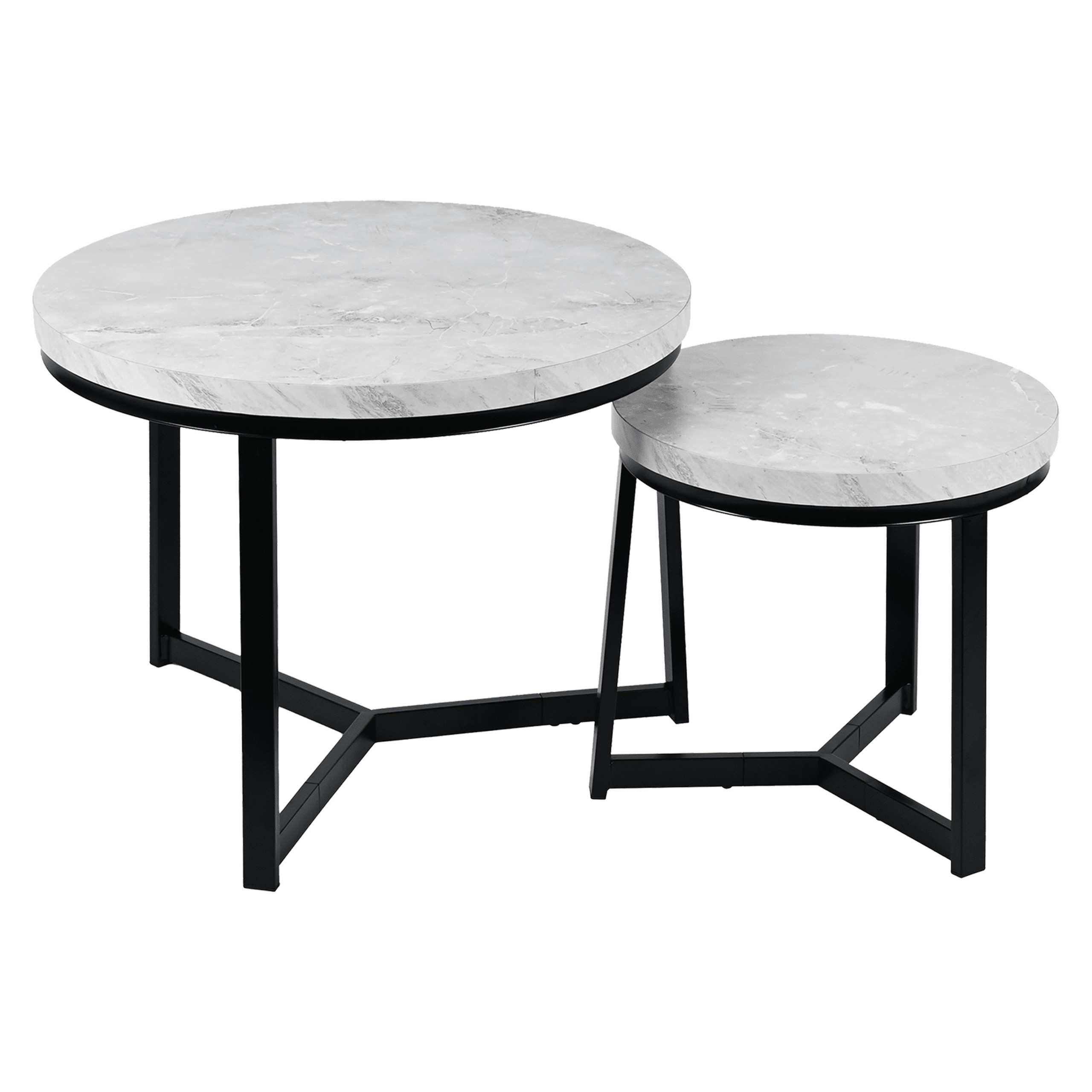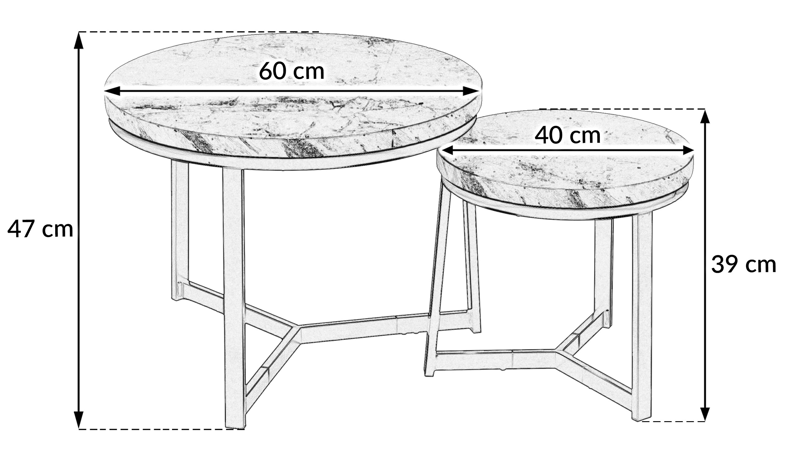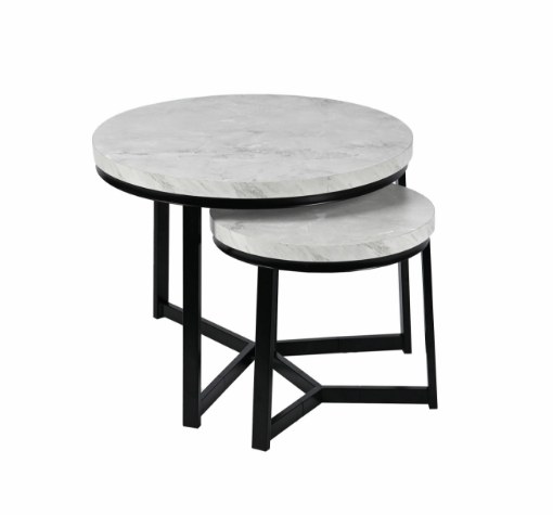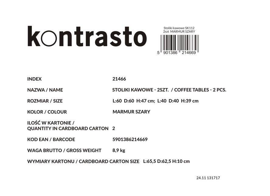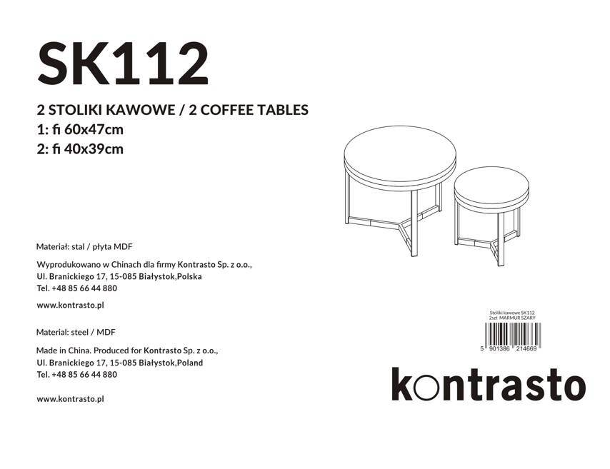 Набір з двох круглих журнальних столиків SK112MSZ – це ідеальний вибір для тих, хто хоче додати сучасних та стильних акцентів до свого інтер'єру. Столики кольору сірого мармуру чудово пасують до вітальні, вітальні або спальні, додаючи елегантності та функціональності. Завдяки сталевій рамі з порошковим покриттям та стільницям з МДФ у відтінку мармуру, вони не тільки естетичні, але й міцні та практичні.