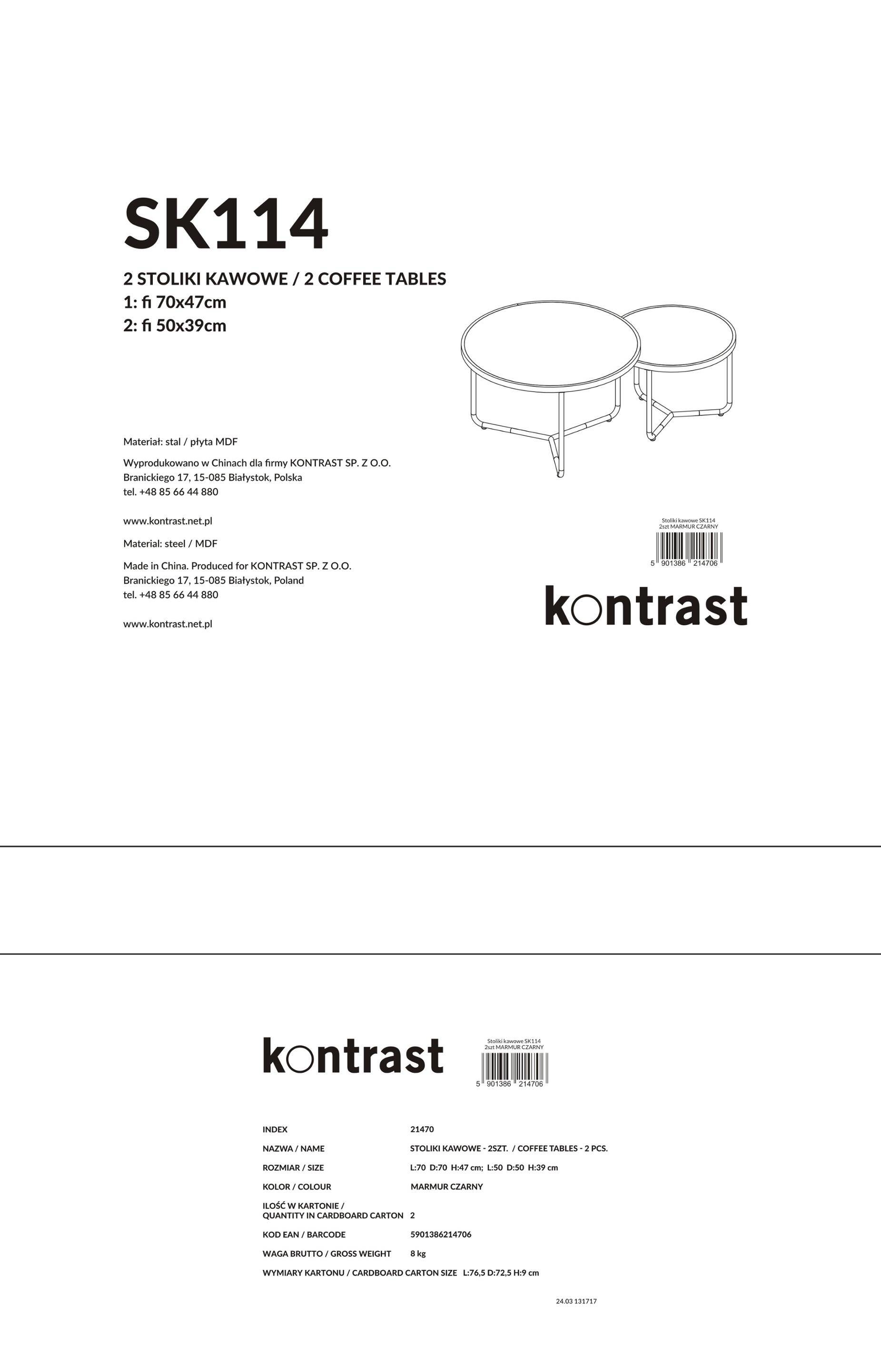 Кавовий столик SK114MCZ – це розкішний комплект із двох круглих кавових столиків, які додадуть елегантності та сучасності будь-якому інтер'єру. Завдяки вишуканому дизайну та високоякісним матеріалам вони ідеально підійдуть для вітальні, їдальні чи офісу.