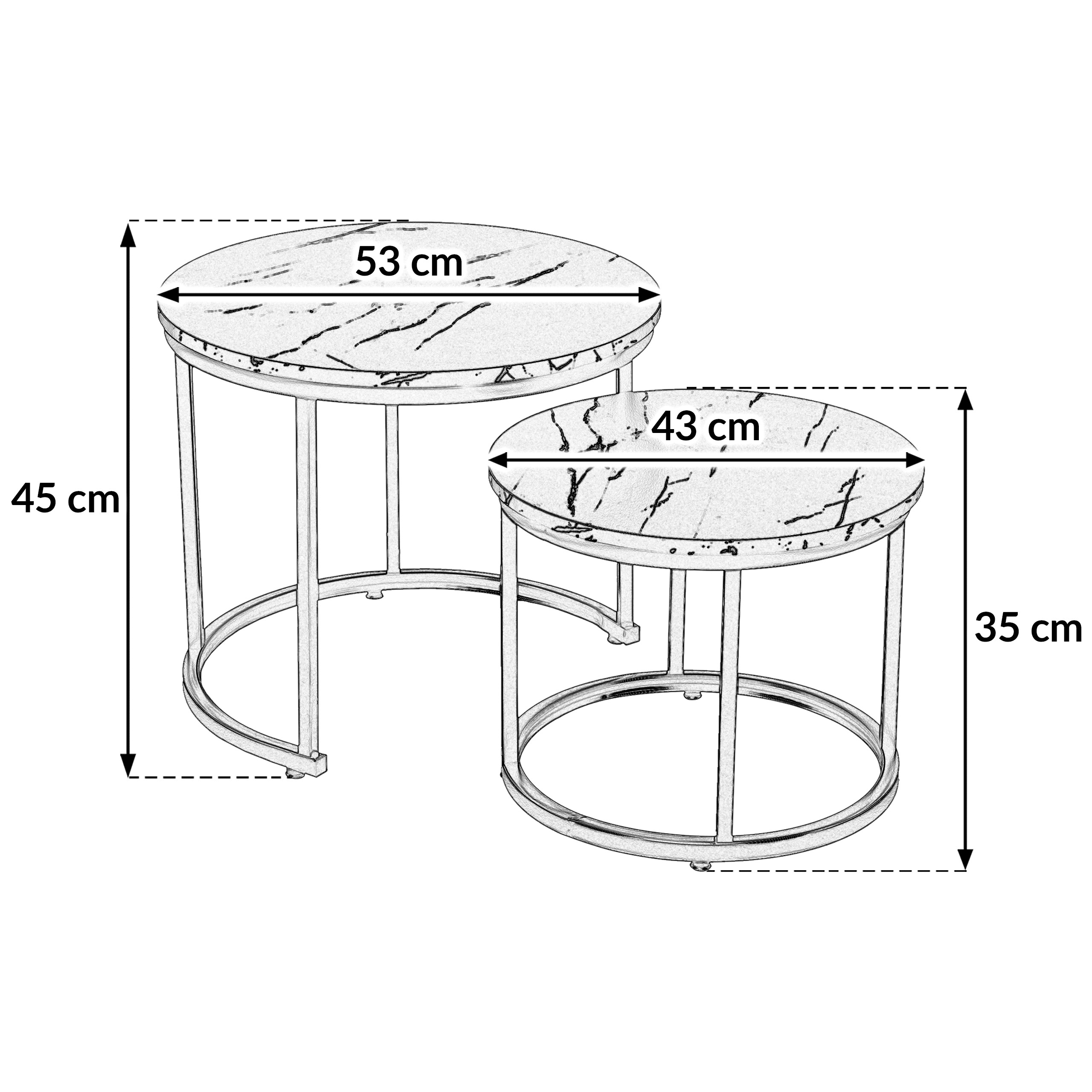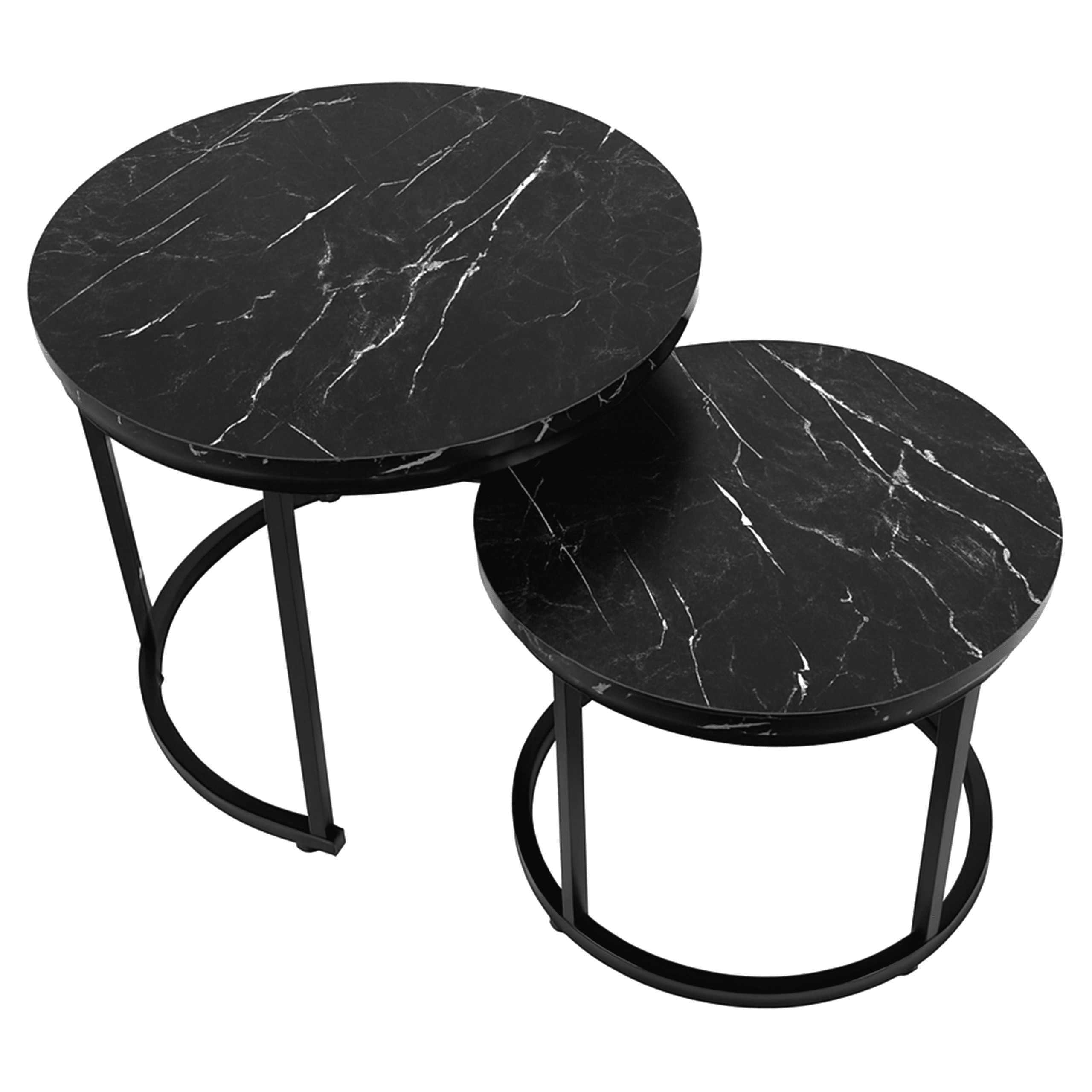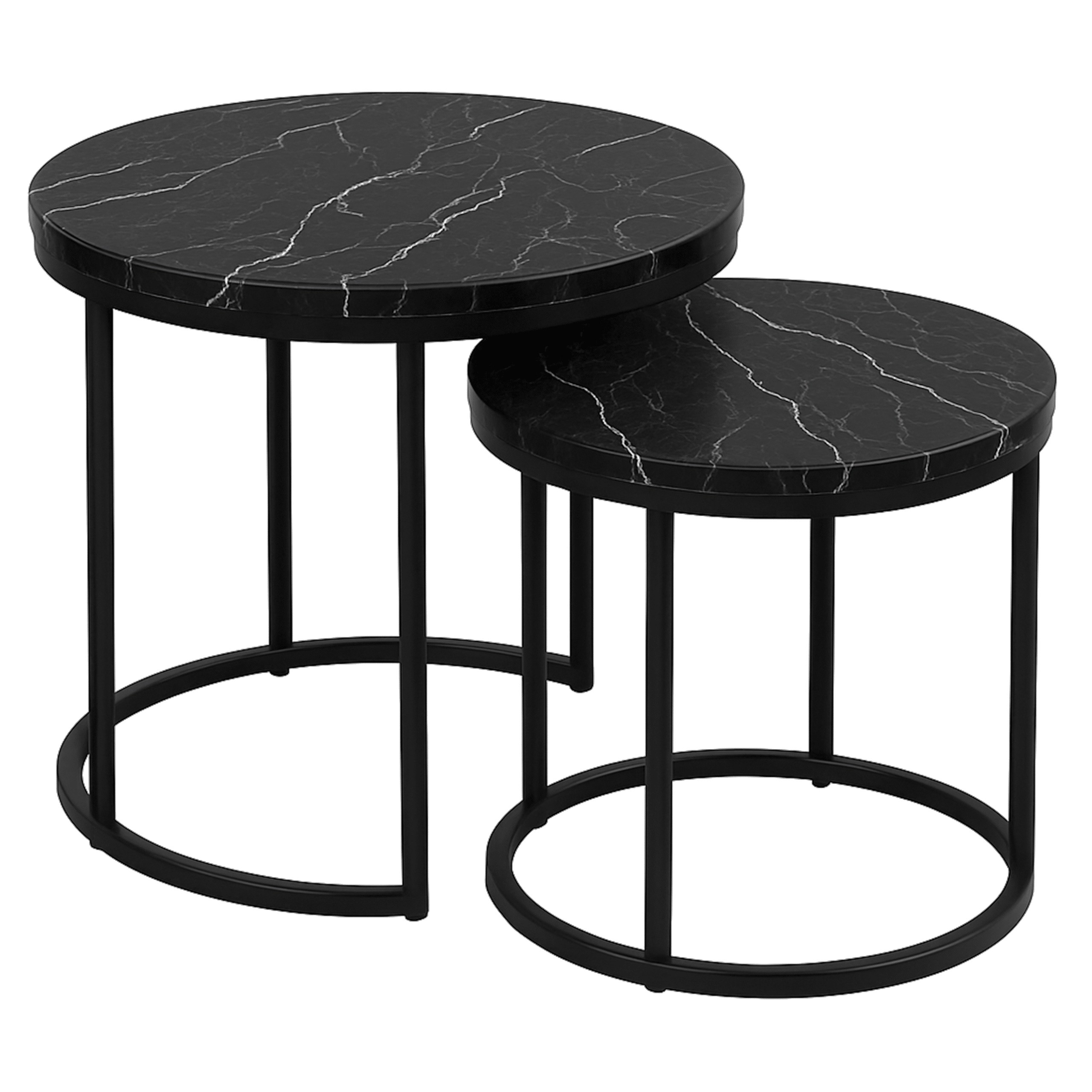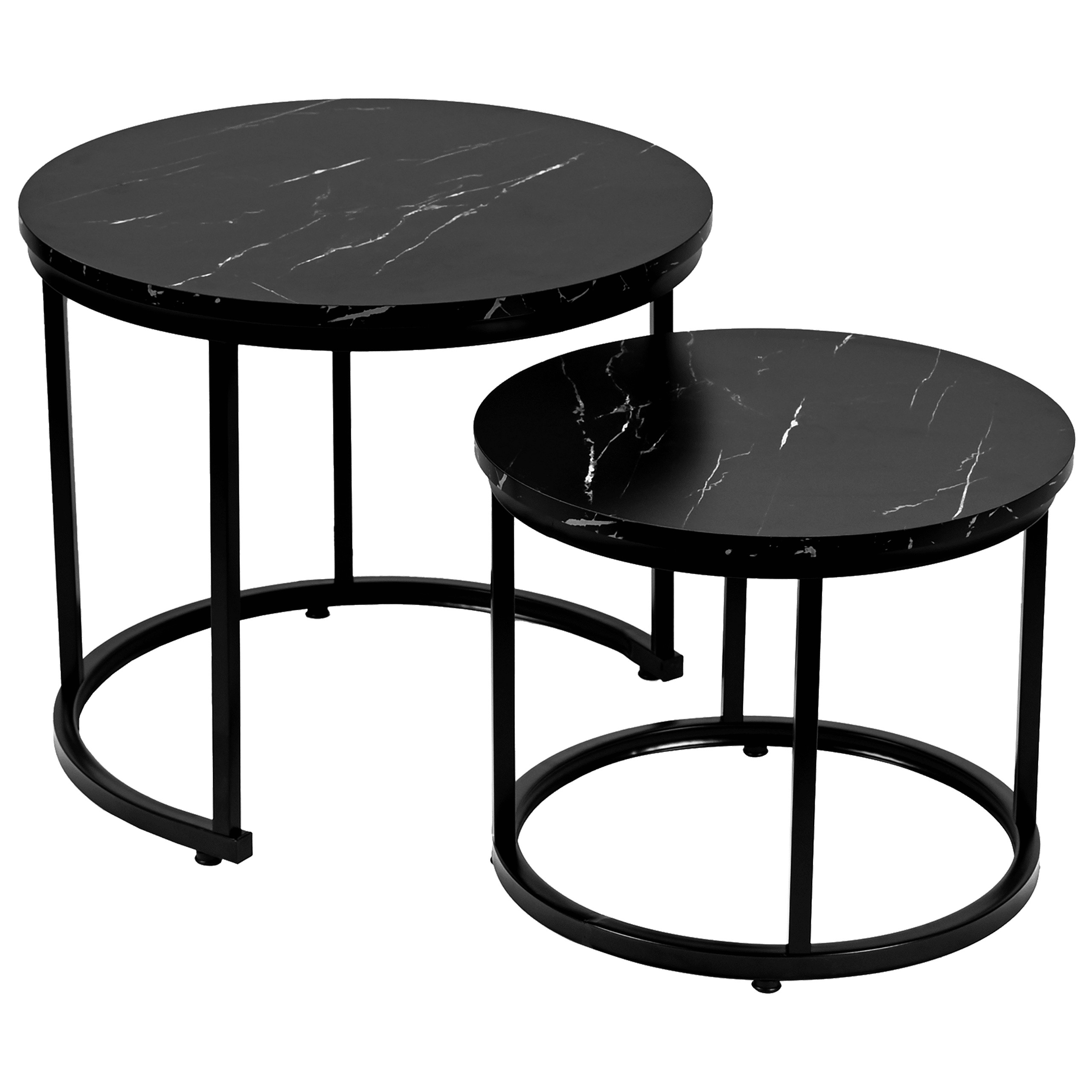 Набір з двох круглих журнальних столиків SK102MCZ – ідеальне рішення для тих, хто шукає сучасні та практичні меблі для свого інтер'єру. Ці елегантні столики в кольорі чорного мармуру чудово вписуються в стиль лофт та індастріал, додаючи нотку розкоші та сучасності до вітальні, вітальні або спальні. Завдяки сталевій рамі з порошковим покриттям та стільницям з ламінованої плити, столики поєднують в собі довговічність та естетику.