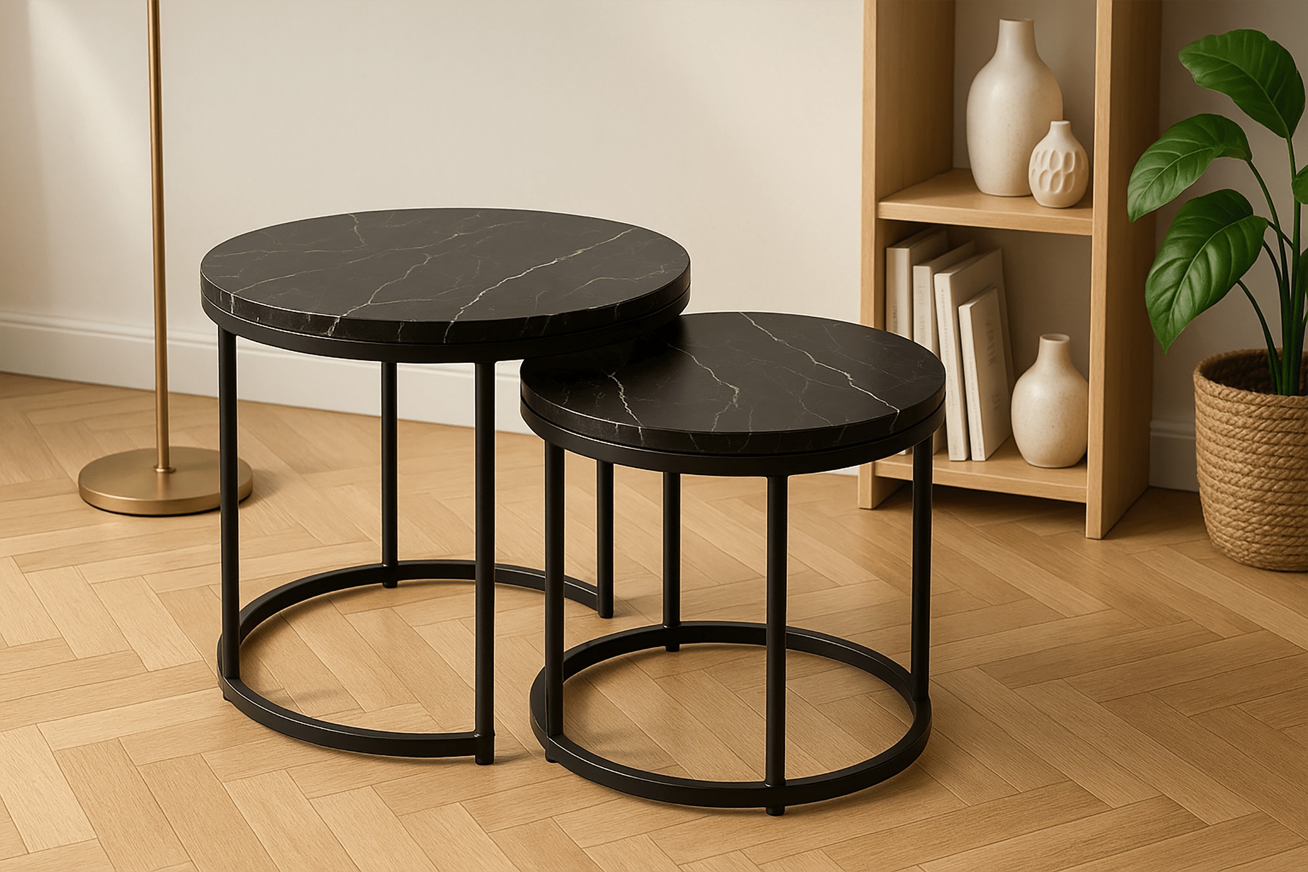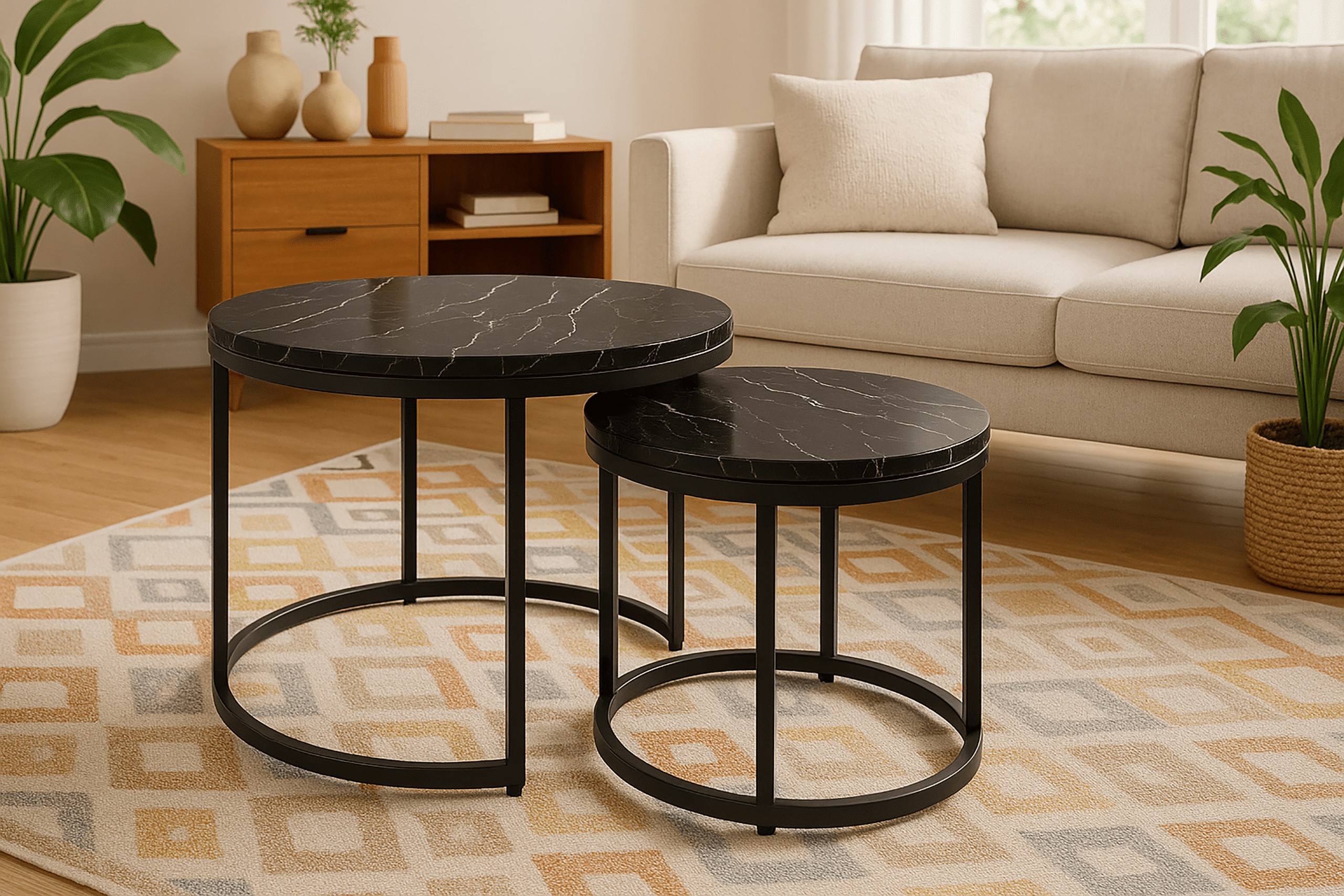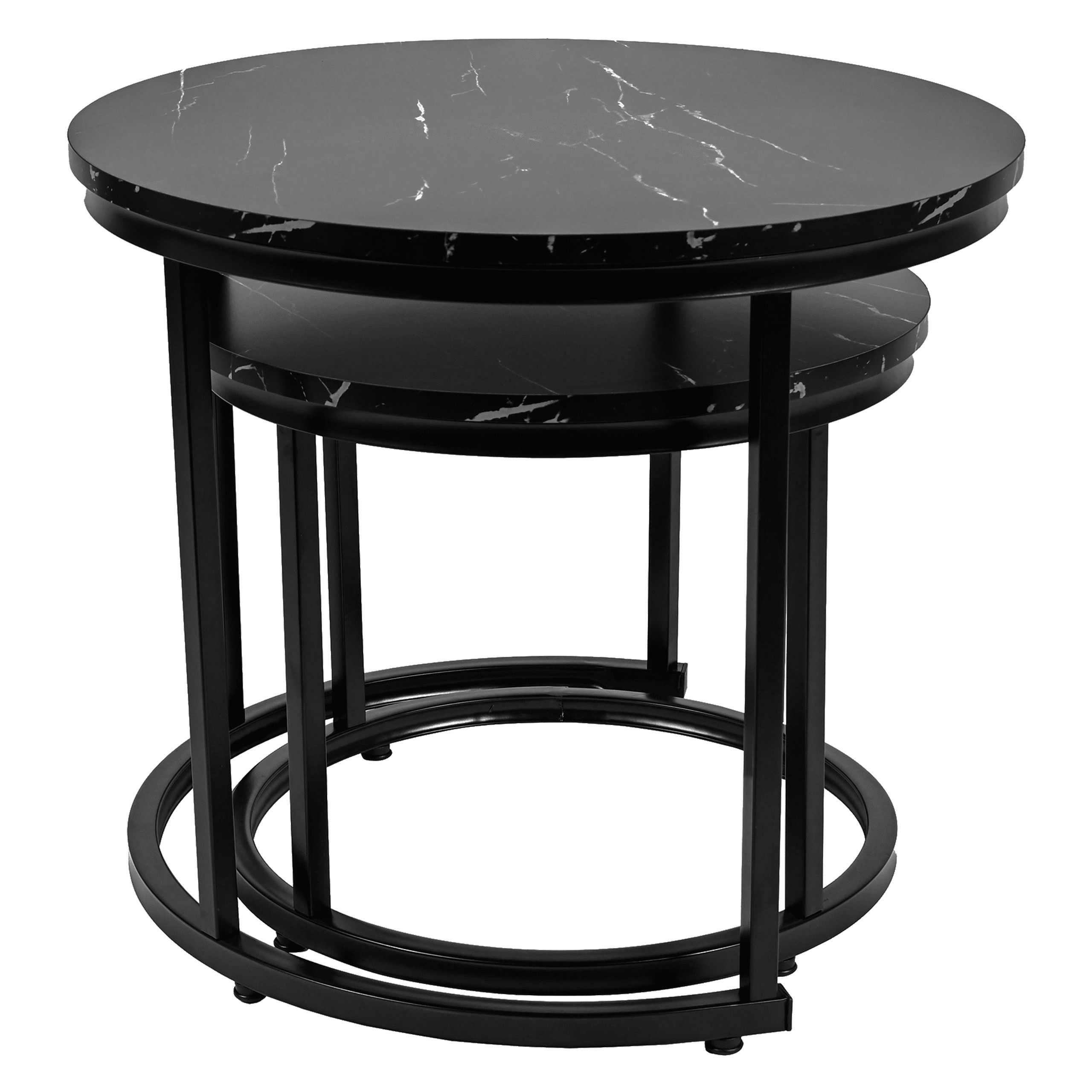 Набір з двох круглих журнальних столиків SK102MCZ – ідеальне рішення для тих, хто шукає сучасні та практичні меблі для свого інтер'єру. Ці елегантні столики в кольорі чорного мармуру чудово вписуються в стиль лофт та індастріал, додаючи нотку розкоші та сучасності до вітальні, вітальні або спальні. Завдяки сталевій рамі з порошковим покриттям та стільницям з ламінованої плити, столики поєднують в собі довговічність та естетику.