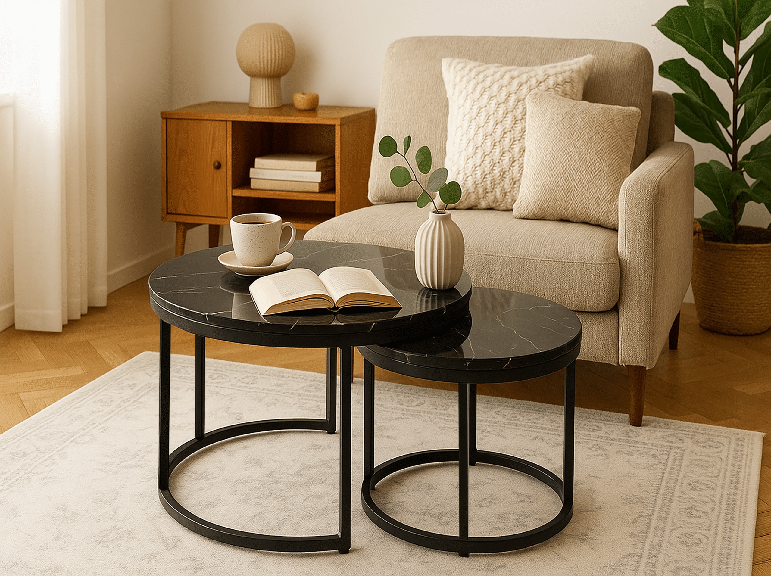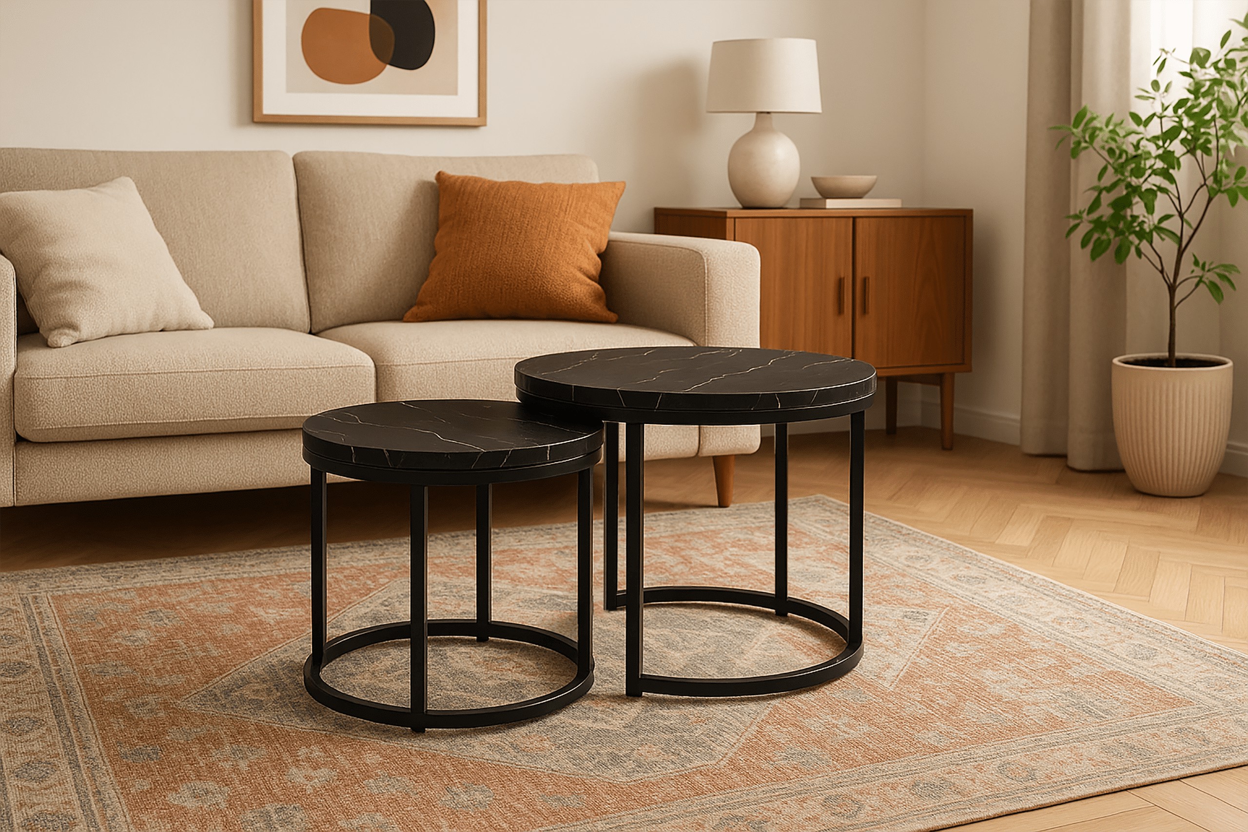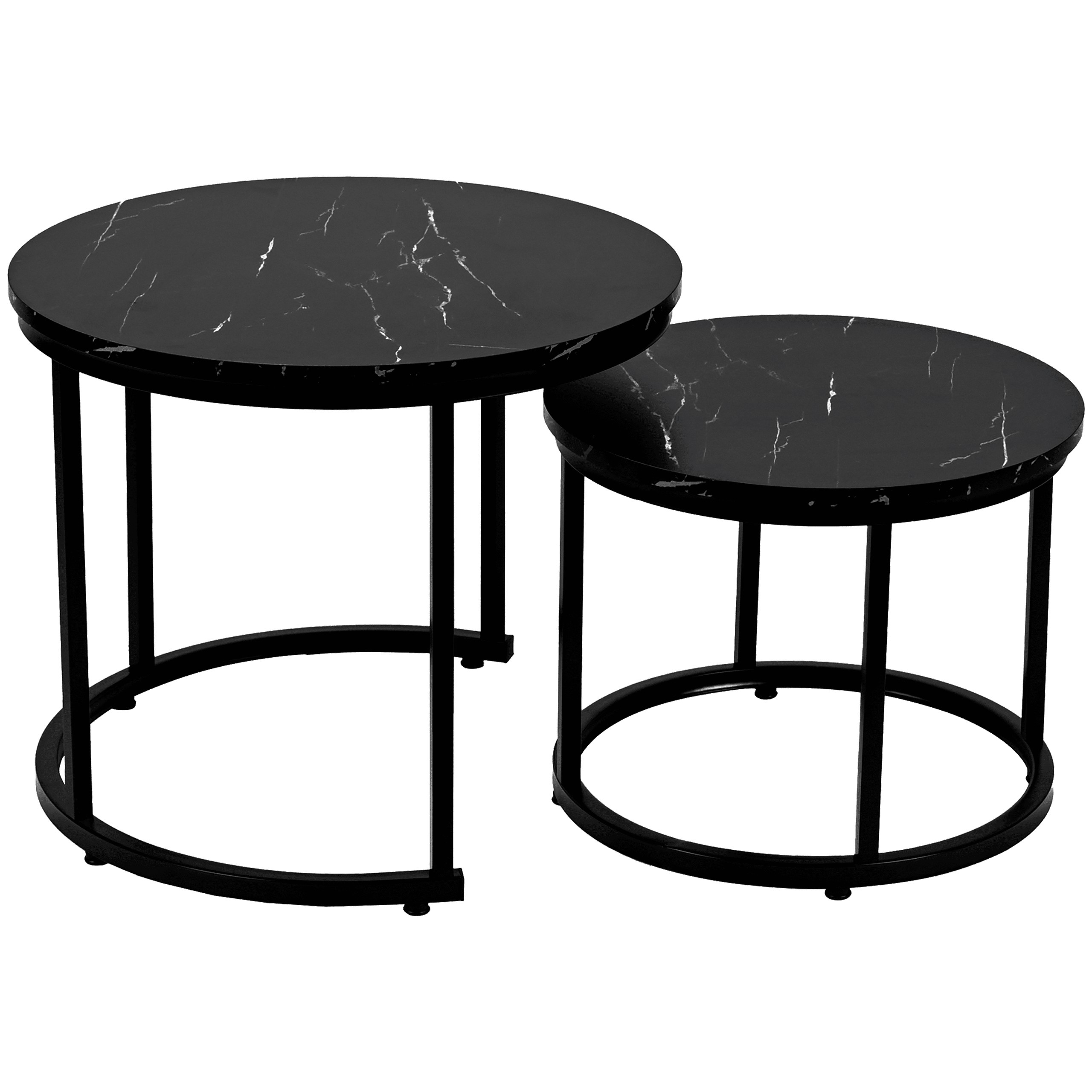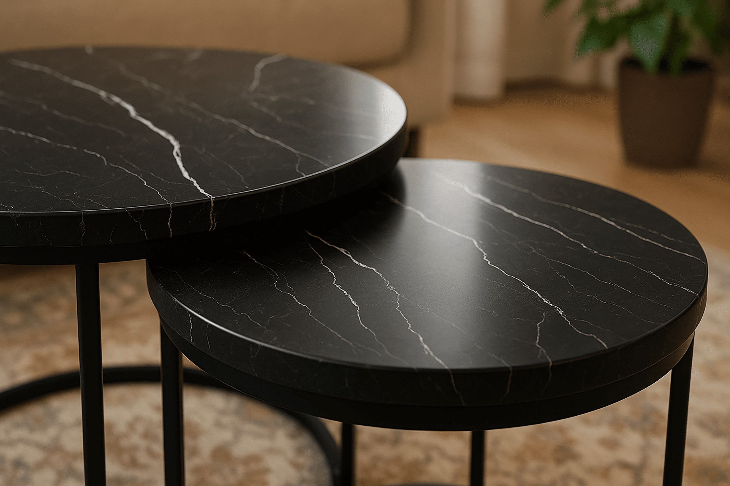 Набір з двох круглих журнальних столиків SK102MCZ – ідеальне рішення для тих, хто шукає сучасні та практичні меблі для свого інтер'єру. Ці елегантні столики в кольорі чорного мармуру чудово вписуються в стиль лофт та індастріал, додаючи нотку розкоші та сучасності до вітальні, вітальні або спальні. Завдяки сталевій рамі з порошковим покриттям та стільницям з ламінованої плити, столики поєднують в собі довговічність та естетику.