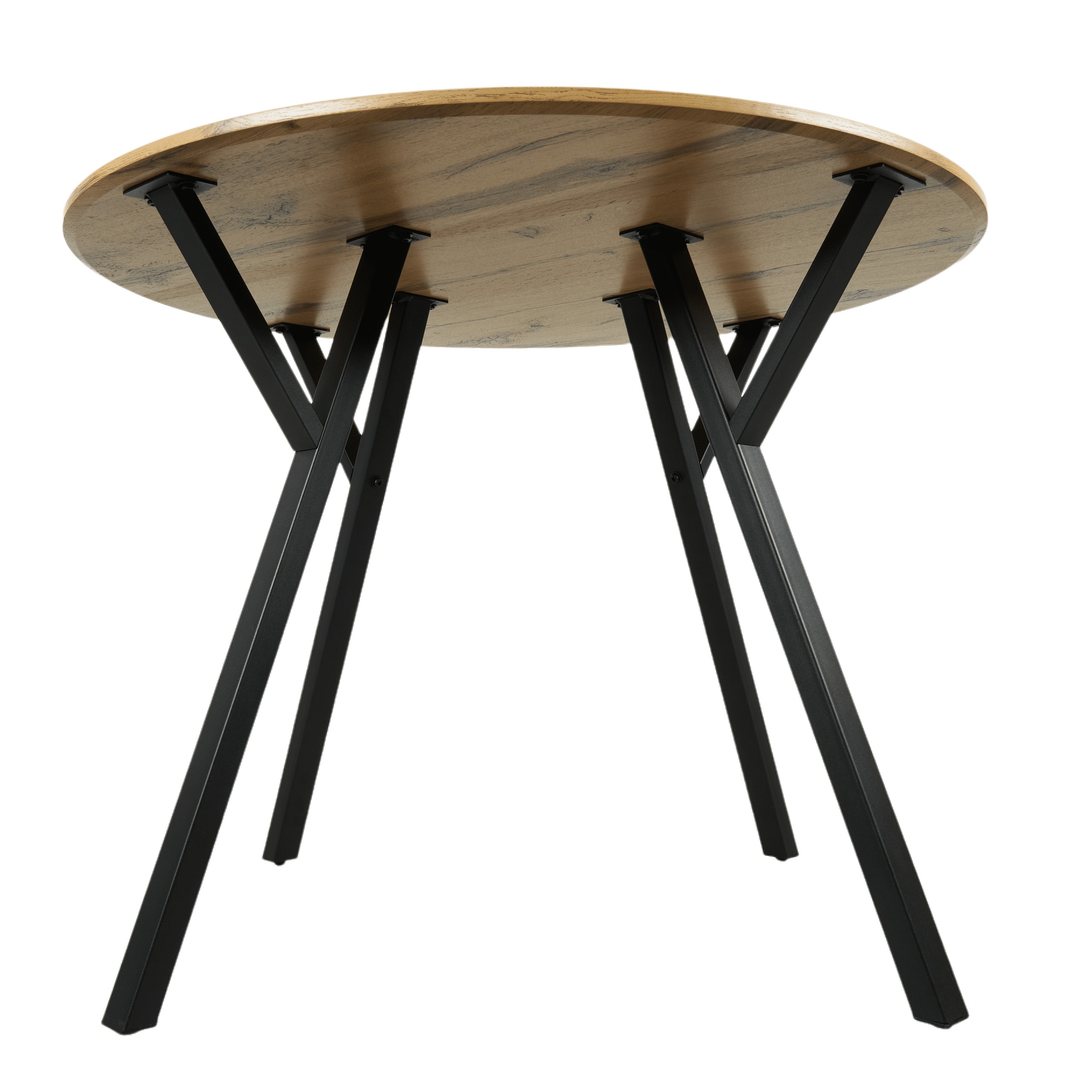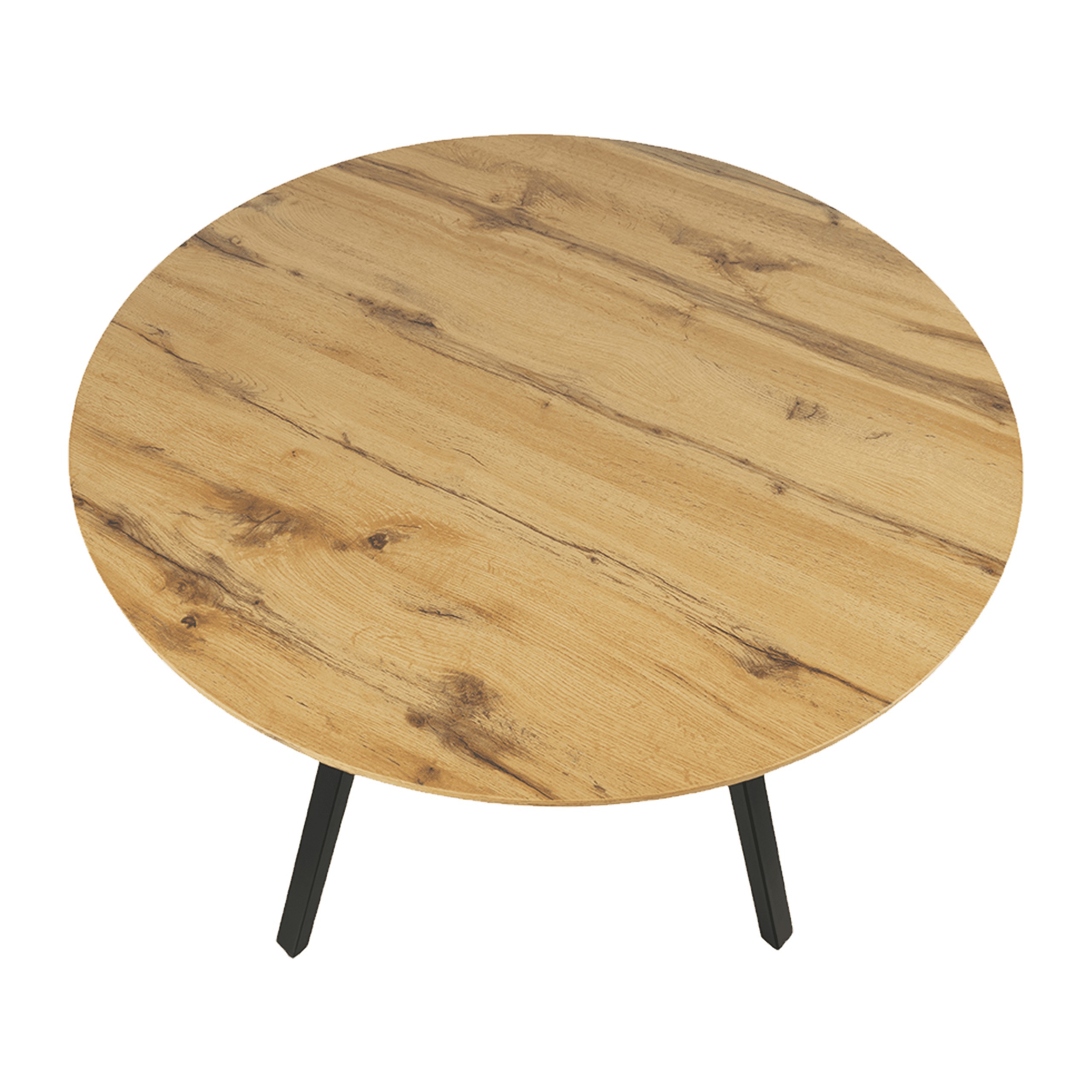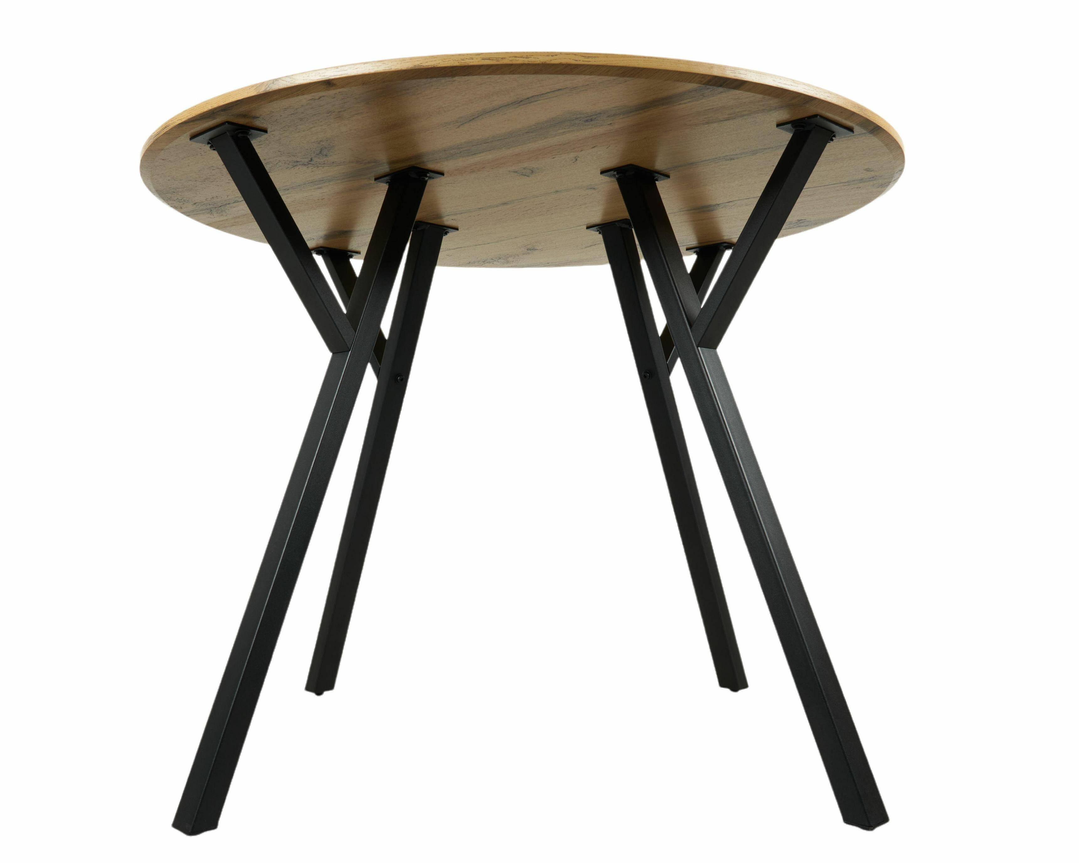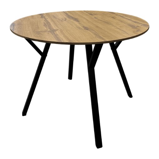 Обідній стіл діаметром 100 см, висота 75 смСтільниця столу з МДФ товщиною 18 мм, обклеєна 3D-паперомСталеві ніжки, пофарбовані порошковою фарбою, з підставкамиДуб рустикальнийУпаковка: 1 стіл у картонній коробціРозміри картонної коробки: 107x107x10 смВага нетто: 16,85 кгВага брутто: 17,55 кг