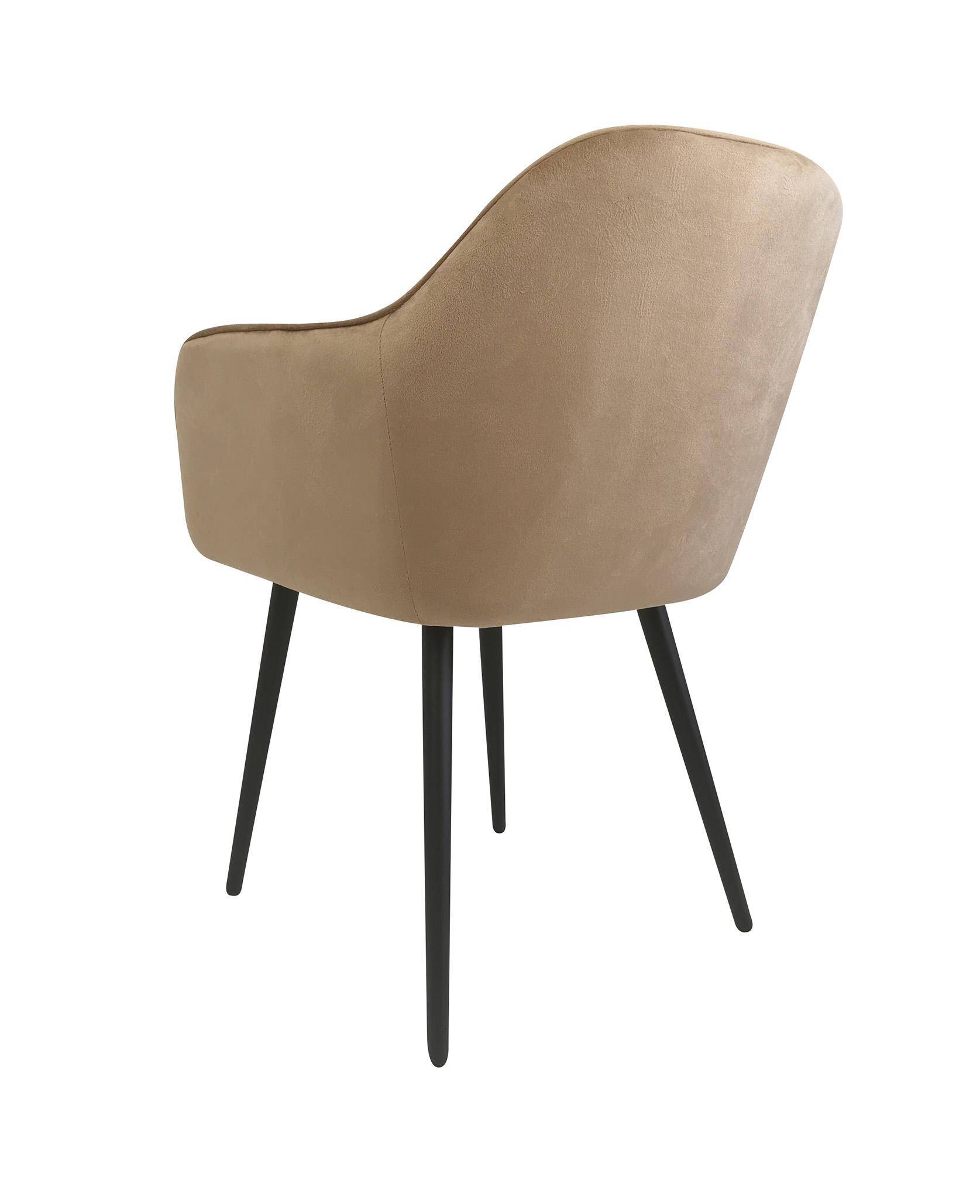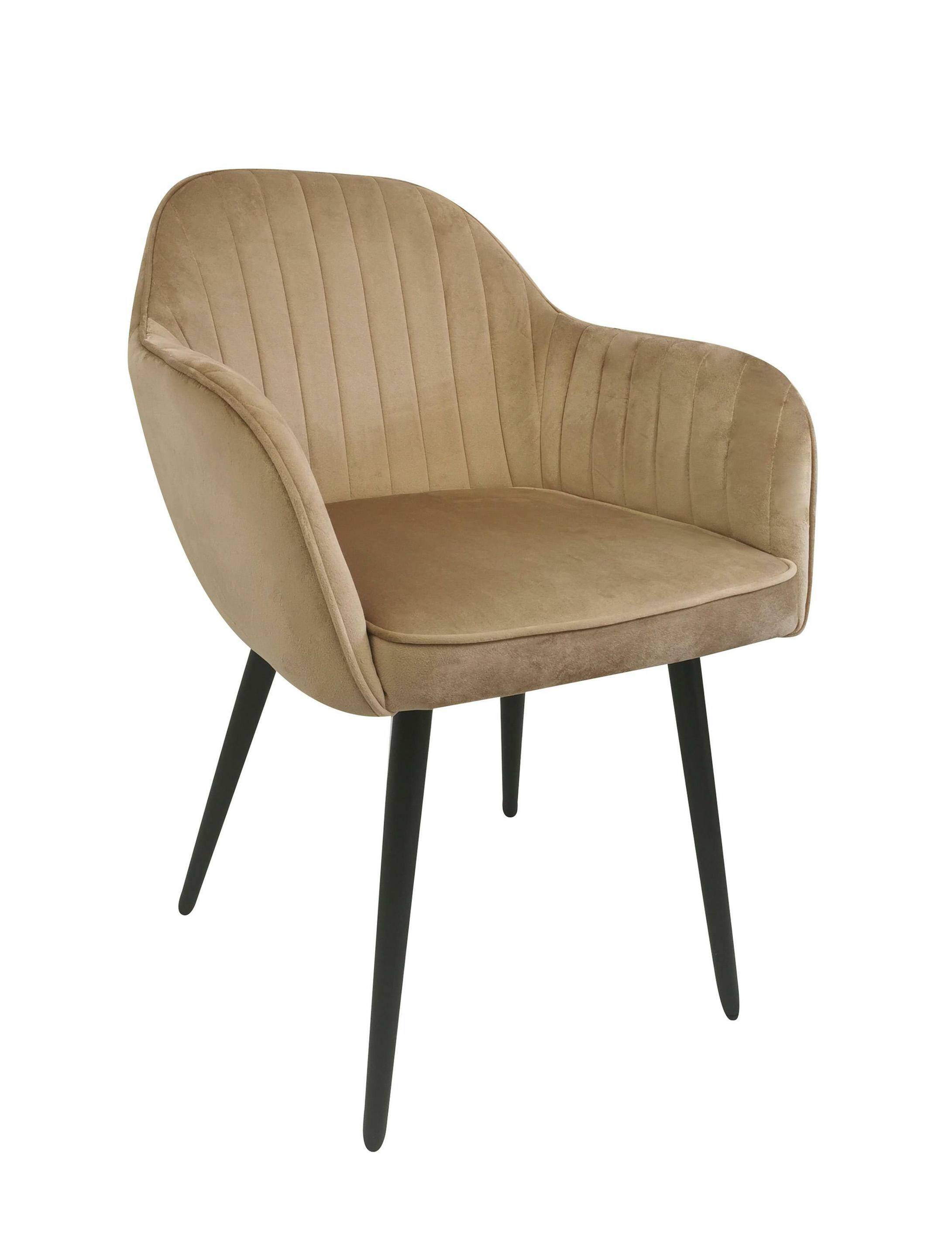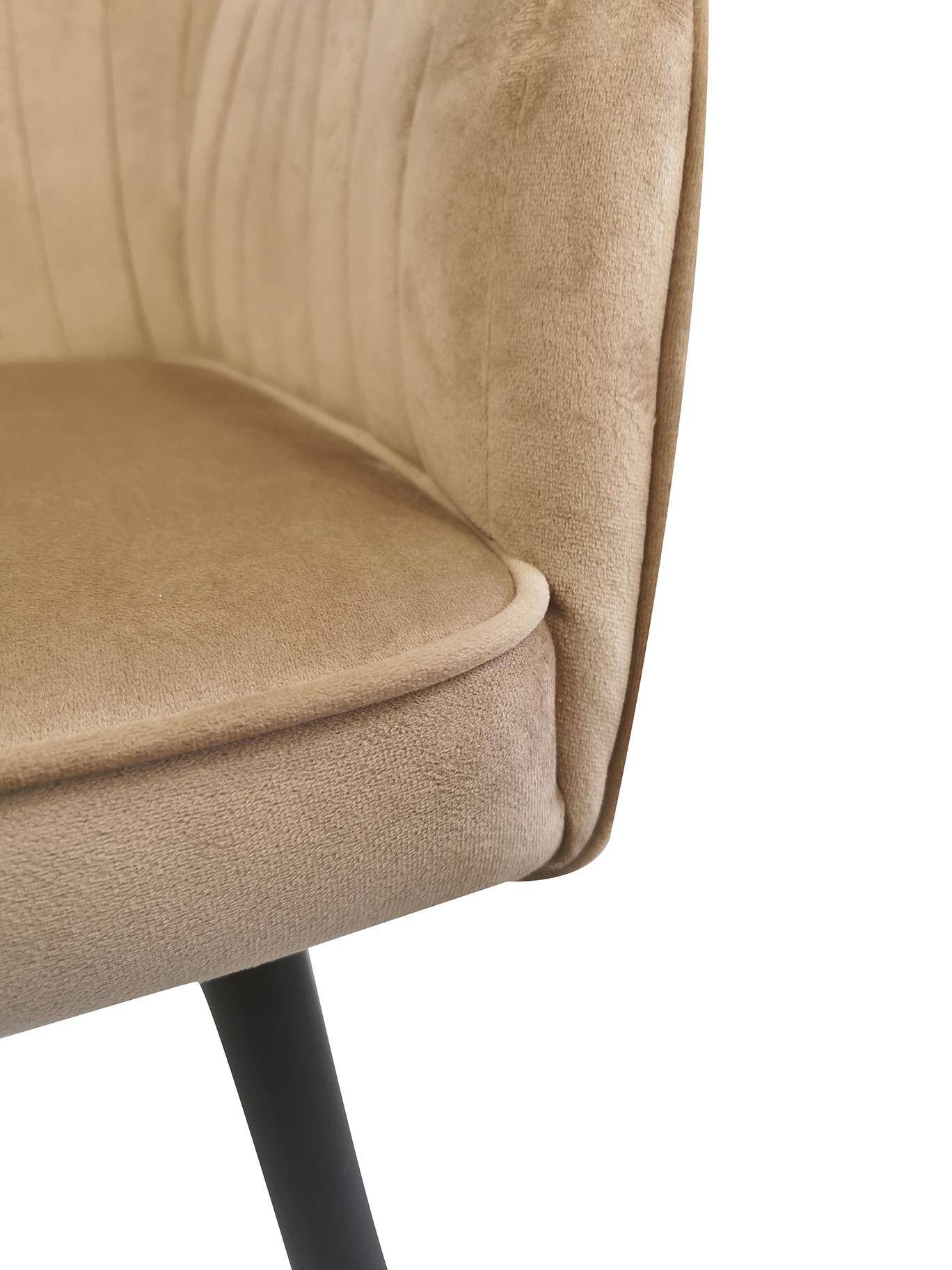 М'яке крісло з підлокітниками для їдальні кольору таупе MARIA поєднує сучасний стиль з ергономічною формою, завдяки чому ідеально вписується в будь-який інтер'єр. Його сидіння наповнене м'якою піною та оббите оксамитовою тканиною, що забезпечує винятковий комфорт.