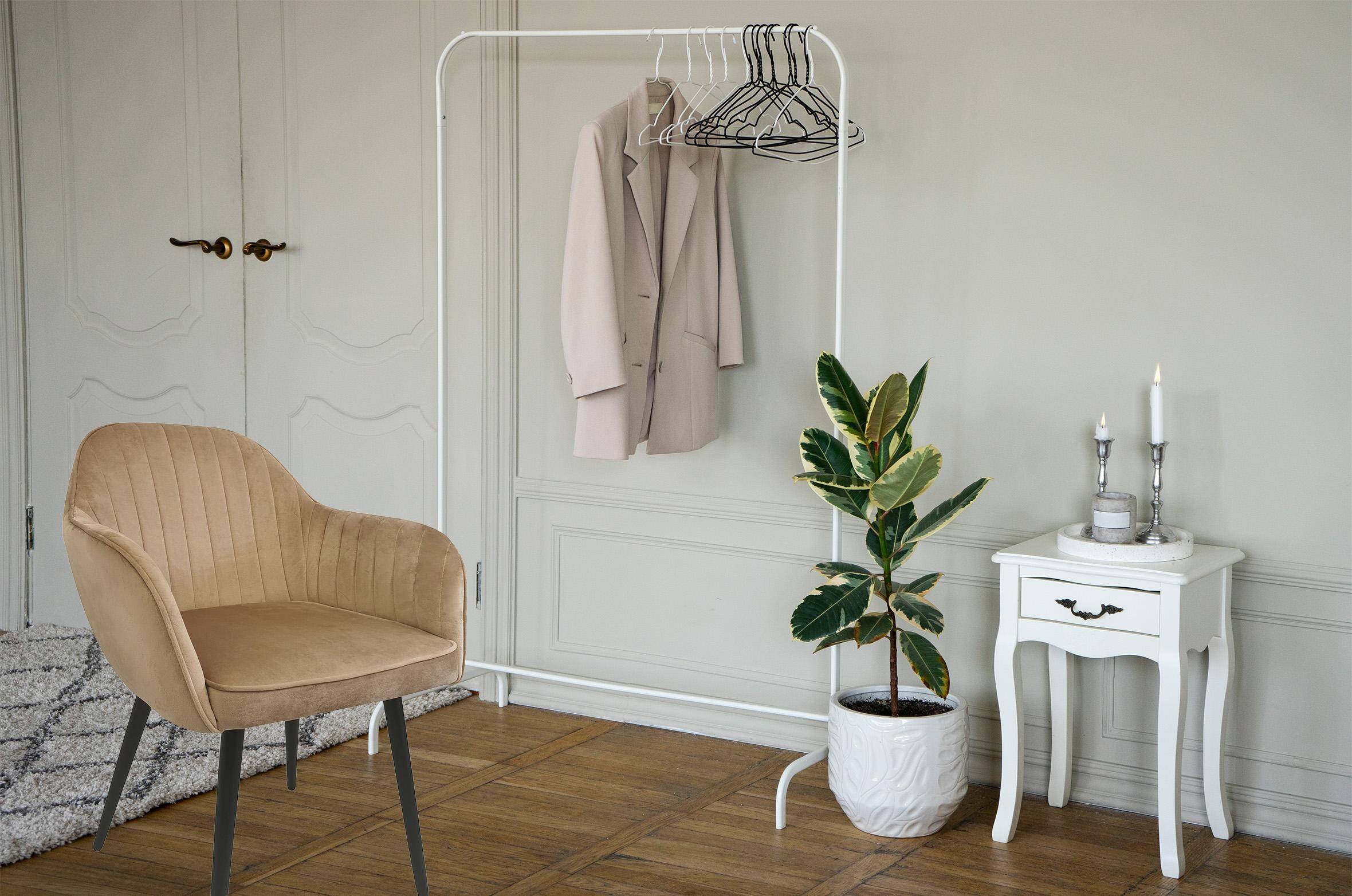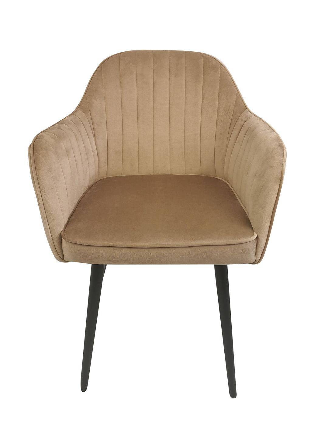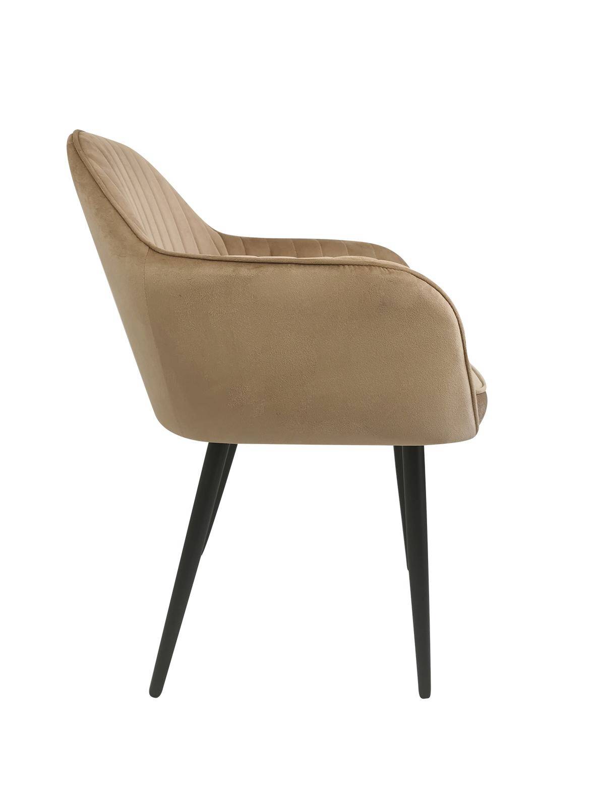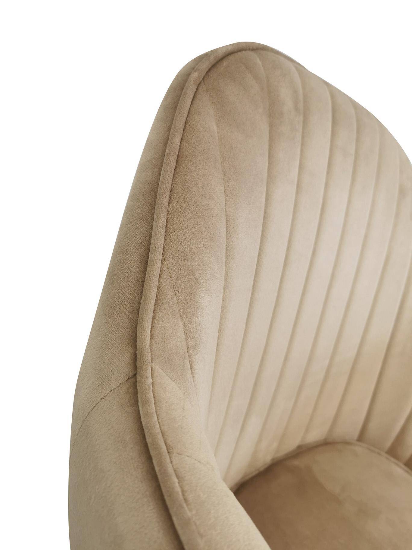 М'яке крісло з підлокітниками для їдальні кольору таупе MARIA поєднує сучасний стиль з ергономічною формою, завдяки чому ідеально вписується в будь-який інтер'єр. Його сидіння наповнене м'якою піною та оббите оксамитовою тканиною, що забезпечує винятковий комфорт.