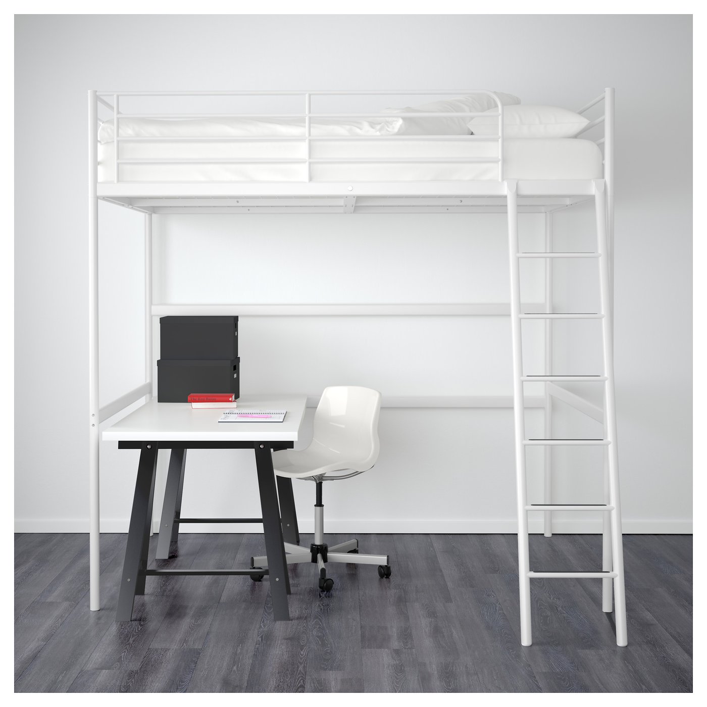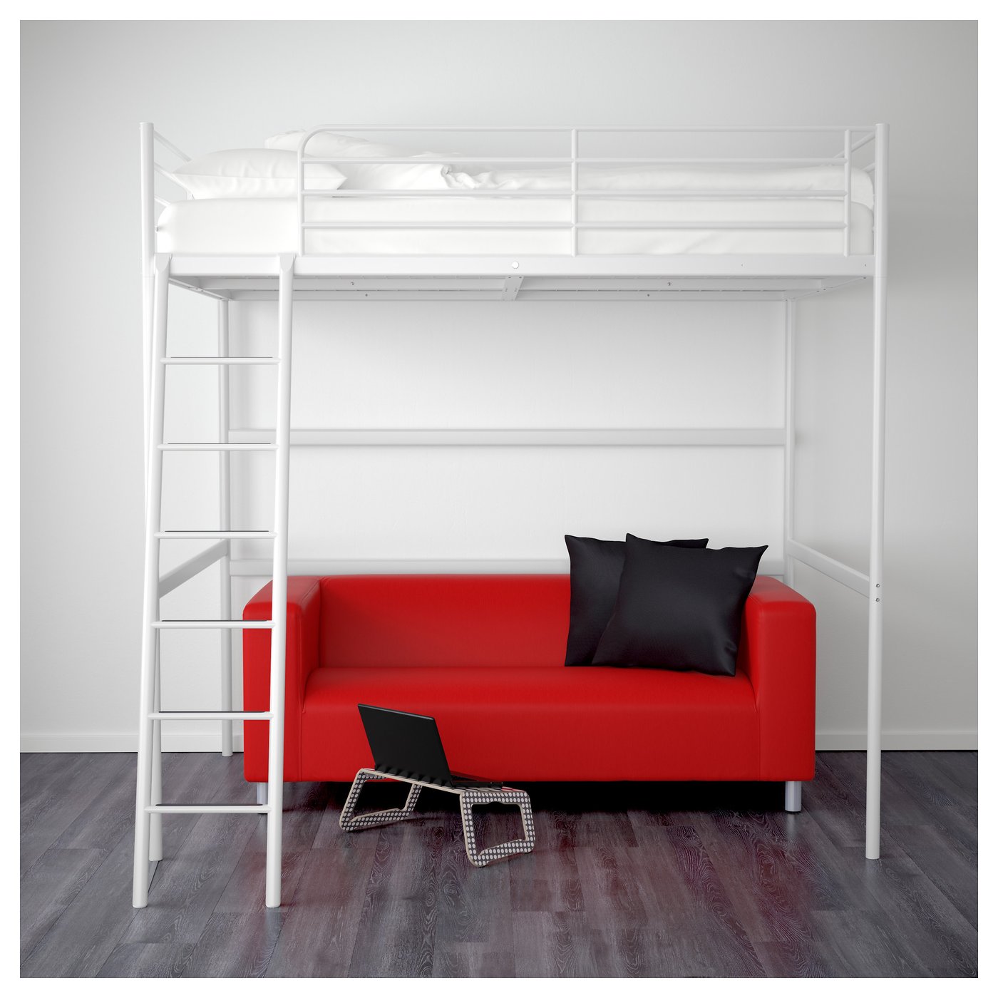 Сходи можуть кріпитися з правого і з лівого боку ліжка. Під ліжком можна організувати місце для відпочинку, зберігання речей або поставити письмовий стіл.